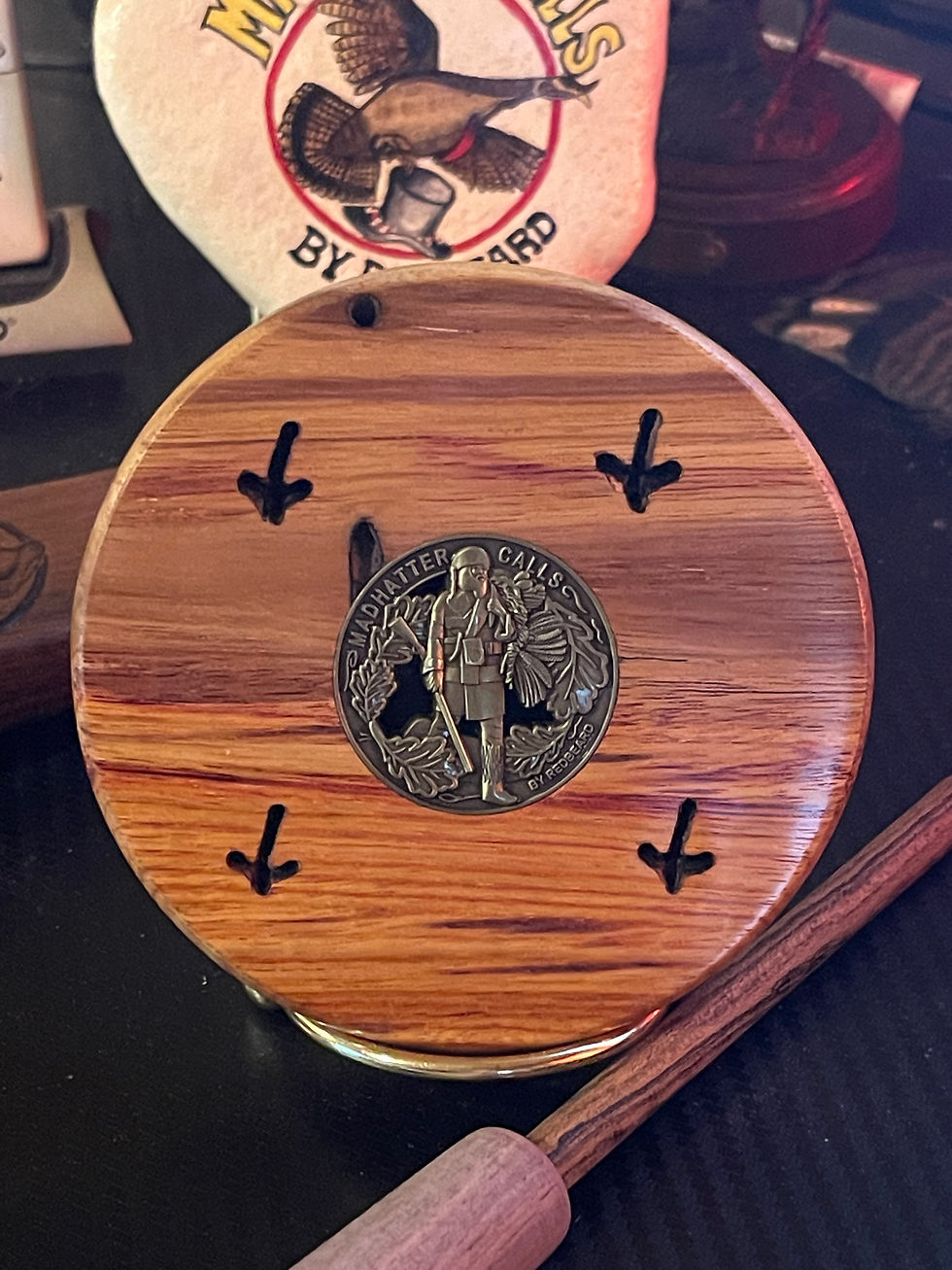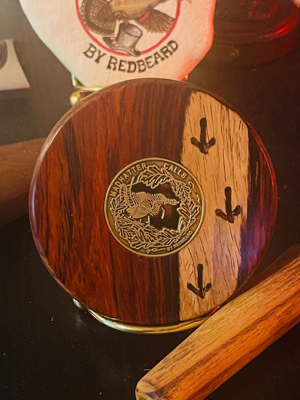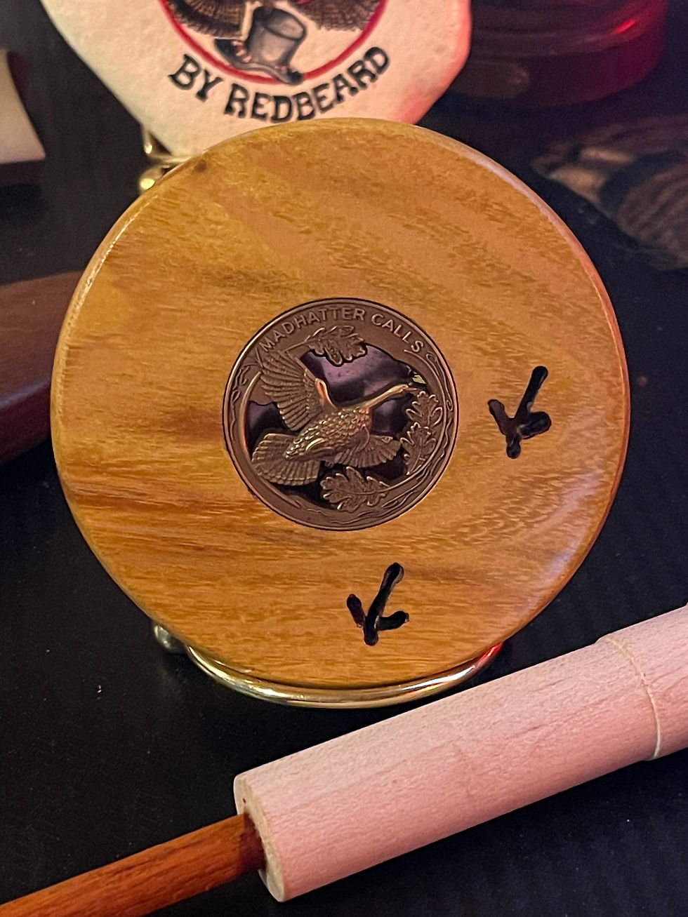 Probably the most saught after track player is the Buckeye Burl copper call. Very hard to find Buckeye burl that wants to be a turkey call but when I do, they go quickly. Photos don't do her justice. She'll hunt and look good doin' it. Excellent rollover note. She will be the death of some wary gobblers without a doubt. 350.00 shipped with striker and logo embossed leather pouch.