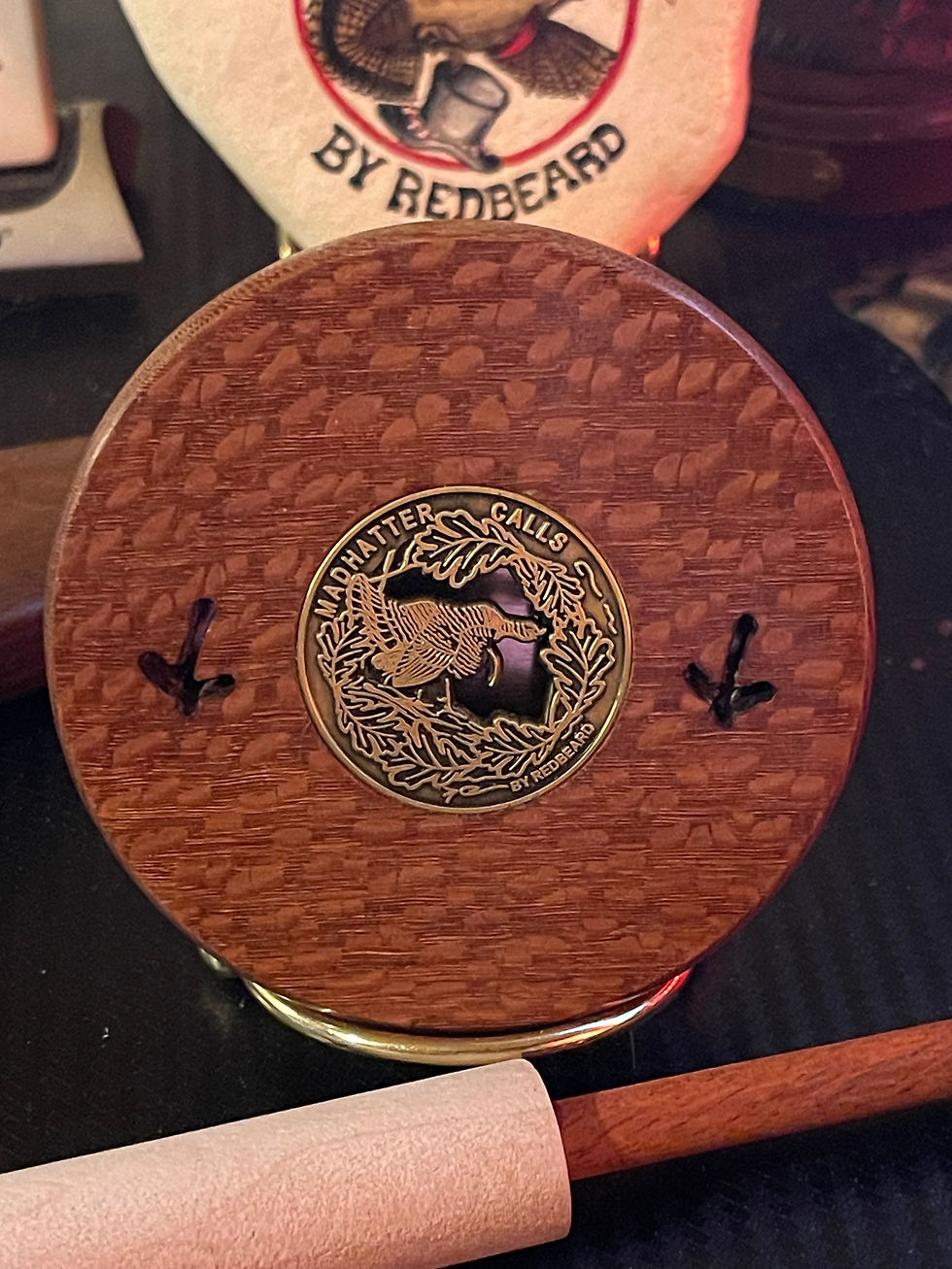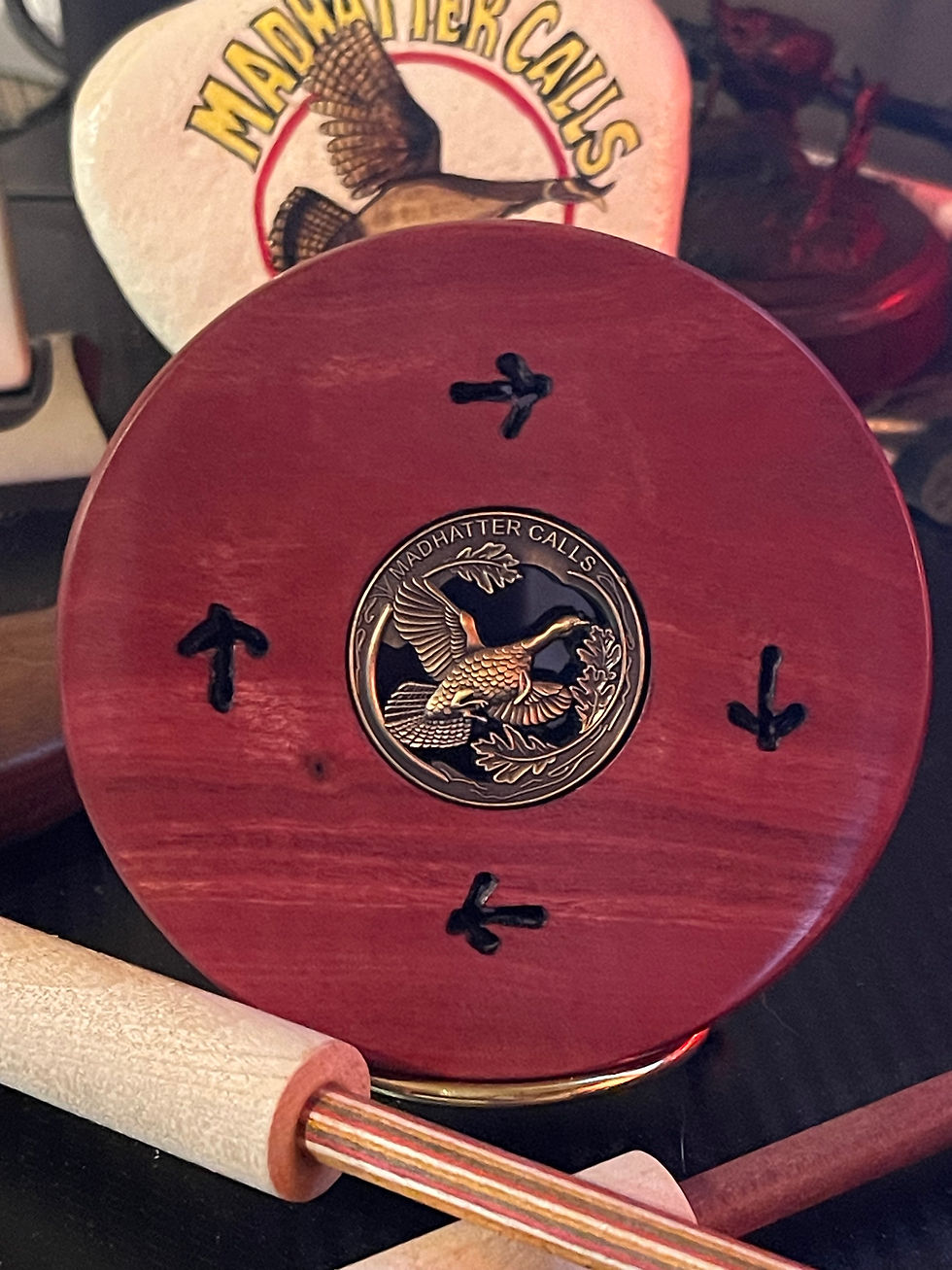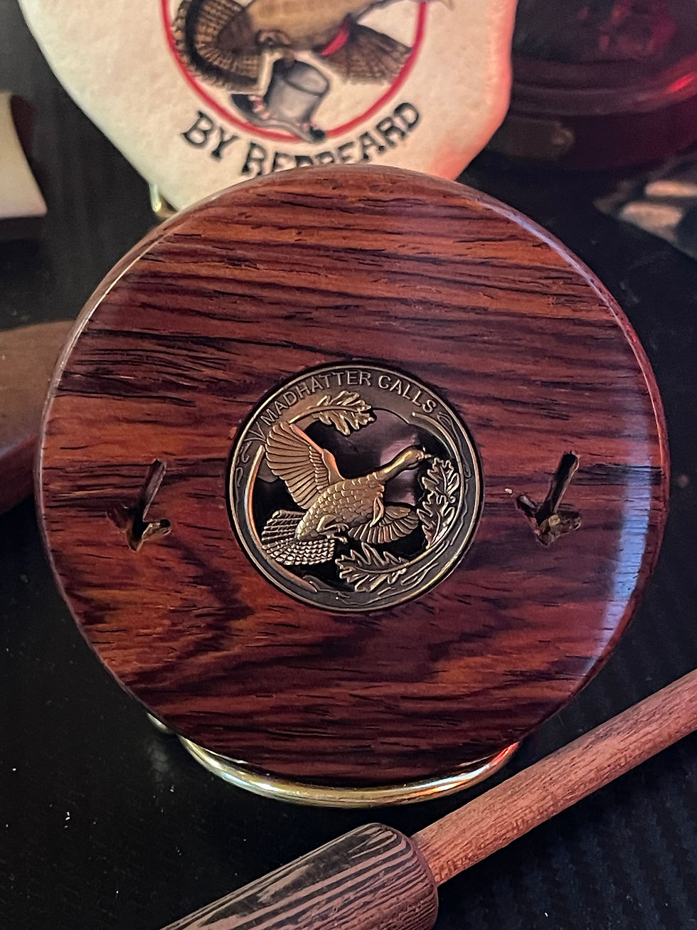 Probably the most saught after track player is the Buckeye Burl copper call. Very hard to find Buckeye burl that wants to be a turkey call but when I do, they go quickly. Photos don't do her justice. She'll hunt and look good doin' it. Excellent rollover note. She will be the death of some wary gobblers without a doubt. 350.00 shipped with striker and logo embossed leather pouch.
